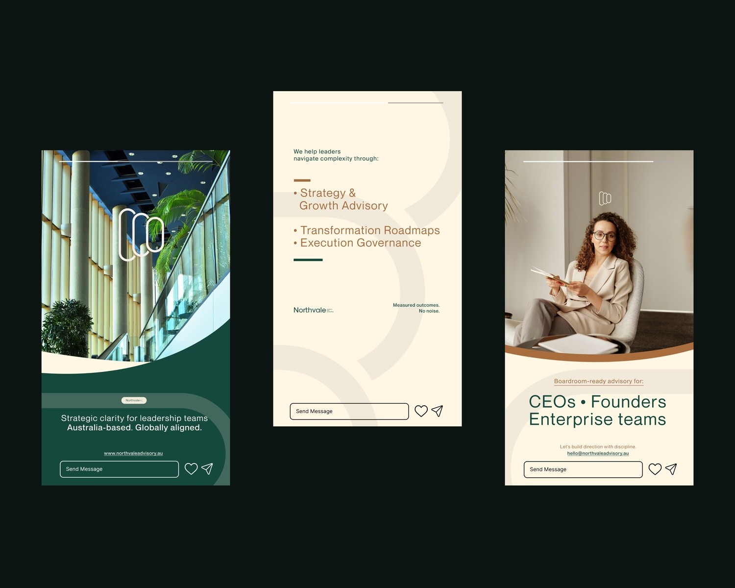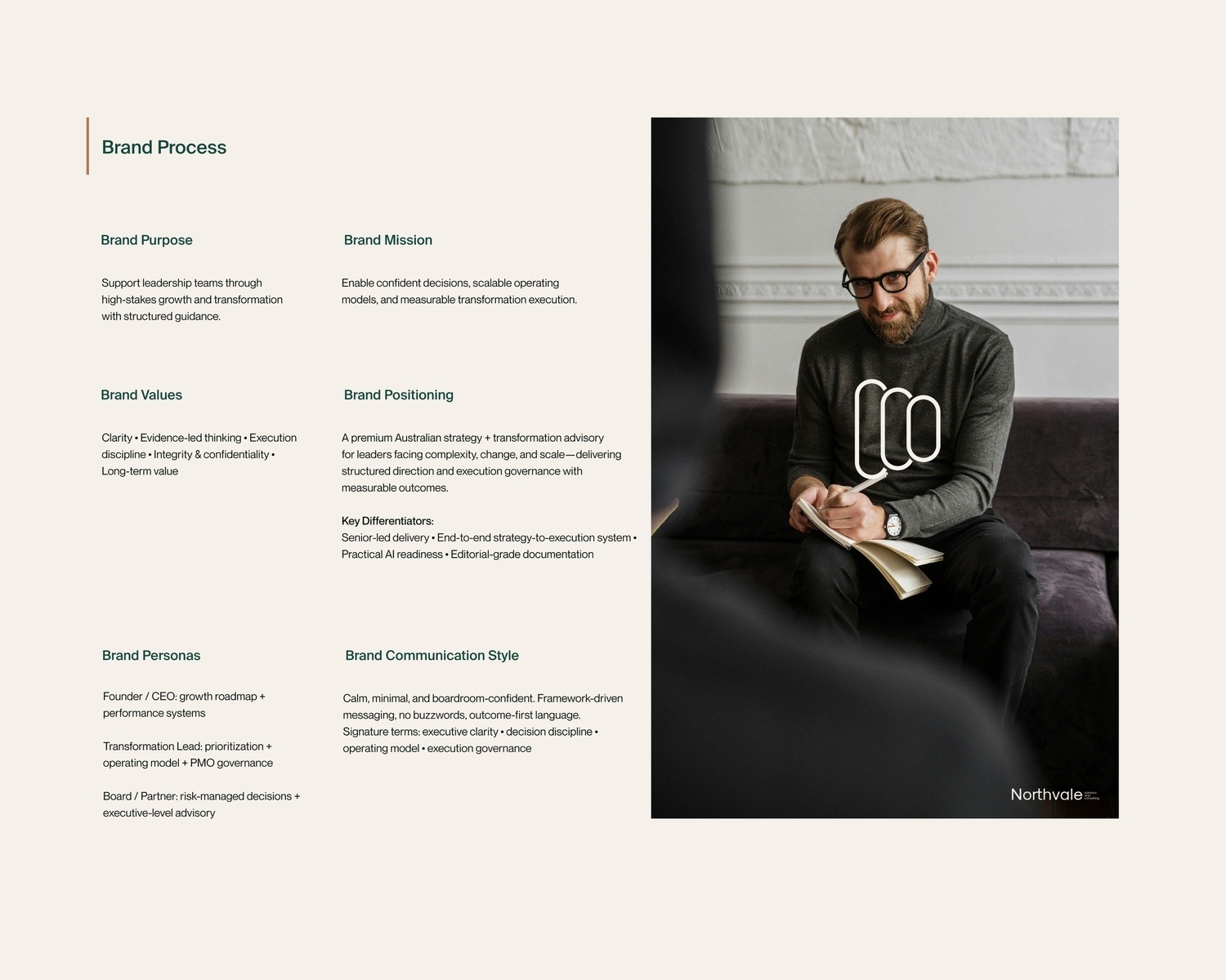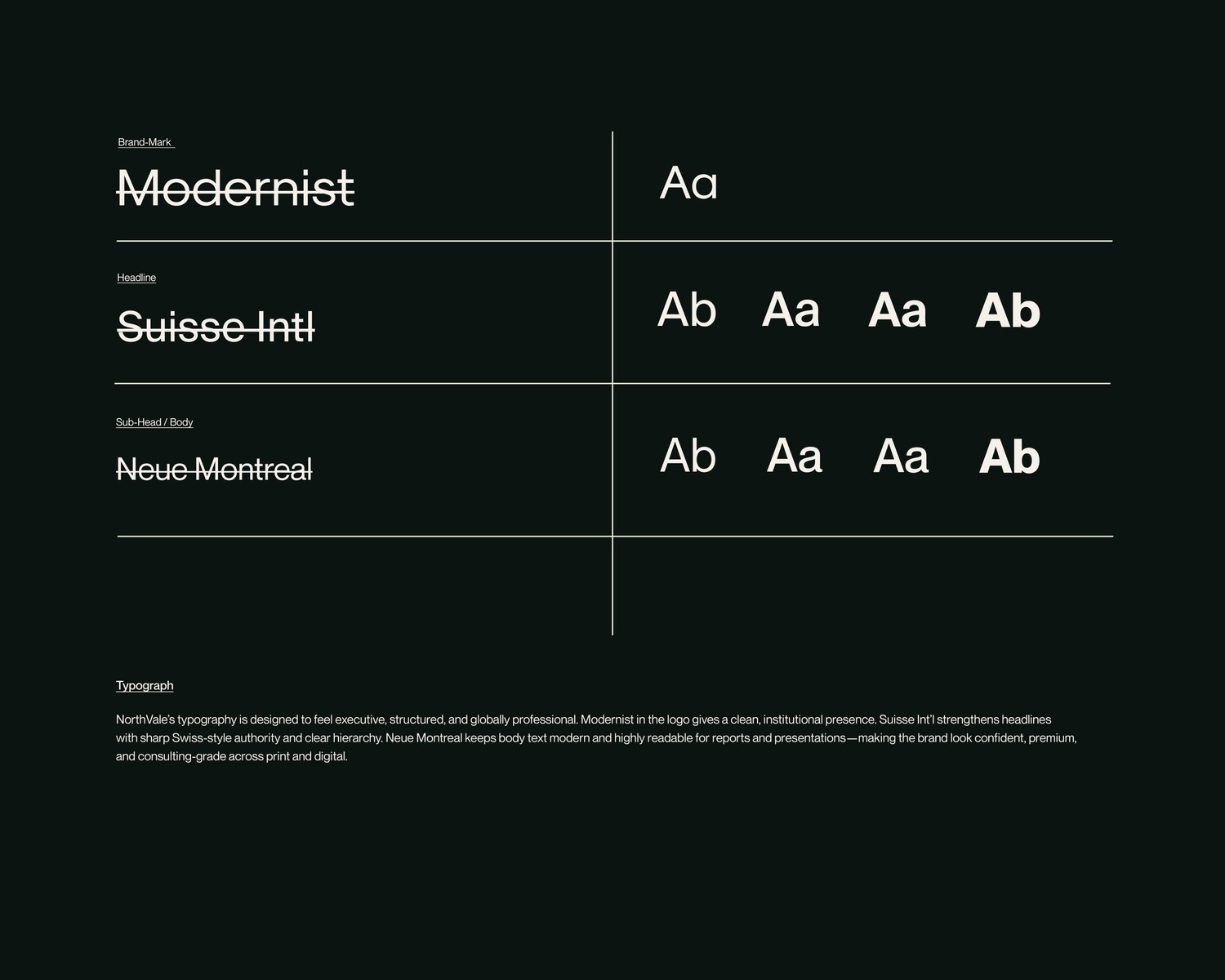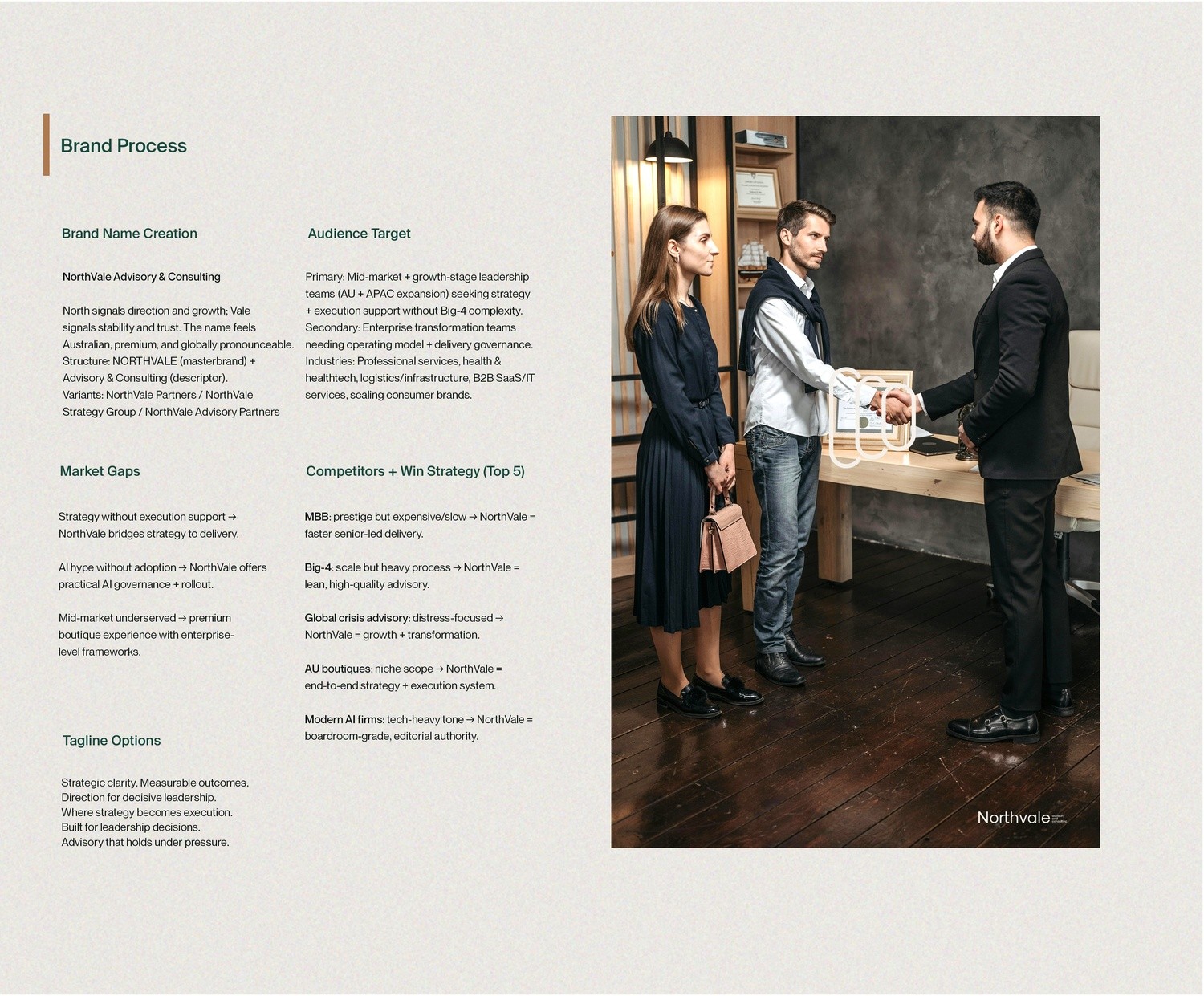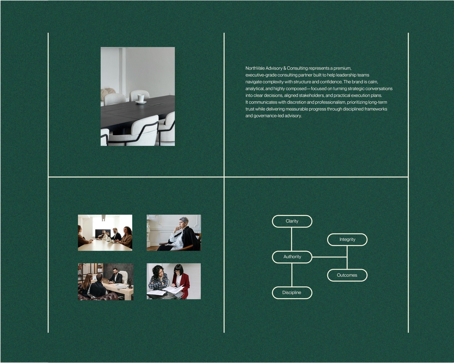 NorthVale is positioned as a premium advisory partner for leadership teams navigating growth and transformation. The brand establishes immediate credibility, enabling trust and alignment, while shifting consulting from abstract strategy to measurable execution with structured, sustainable outcomes across evolving business environments.